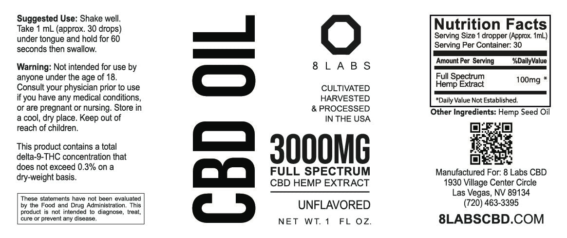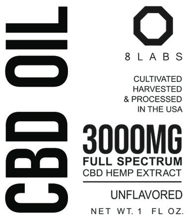 8Labs CBD Full Spectrum Organic CBD Oil 3000MG : is a pure, clean and powerful, full spectrum, organic CBD hemp oil extract made from top grade hemp and MCT oil. Cultivated, harvested and processed in the USA. Nanoemulsified for superior liposomal absorption. Contains 3000mg CBD per 1 oz. bottle.